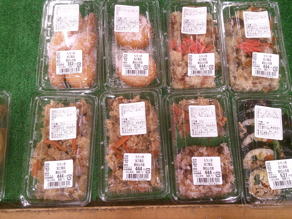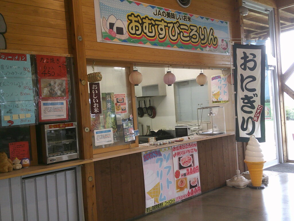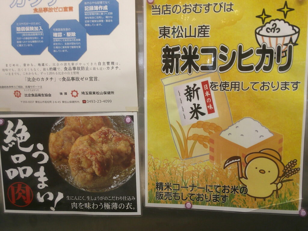 当店のフードコートにて、東松山市産の新米コシヒカリを使った「おむすびセット」を販売中です!中の具は、シーチキン、昆布、たらこ、明太子などからお選びいただけます。また、から揚げや卵焼きも単品で販売していますので、セットと合わせてボリュームアップもできますよ!
