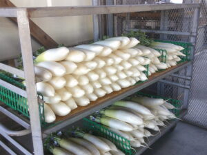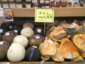 また、当店のかぼちゃコーナーには、「九十九栗」や「伯爵」、「坊ちゃんかぼちゃ」など様々な品種が並んでいます。本来、夏野菜であるかぼちゃですが、長期保存ができる為、冬の寒い時期、栄養豊富な野菜として出荷されています。