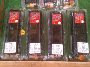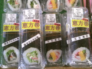 今日は節分の日ですね。お弁当コーナーには、具だくさんの恵方巻きが入荷しました。かんぴょう、人参、きゅうり、桜でんぶなど野菜たっぷりの太巻きや、海鮮太巻き、五目巻きなど並んでおります。無病息災や商売繁盛を願って、恵方(今年は南南東です)に向かって食べましょう。