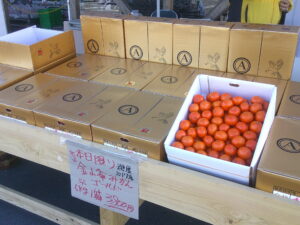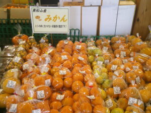 今日は外売りコーナーにて、みかんの試食販売を行っております。とても甘い金峰みかんや、みかんの甘さとオレンジの爽やかな香りを併せ持つ「はれひめ」もありますよ。ぜひご利用下さい。