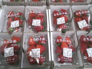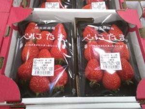 今日も苺がたくさん入荷しました。東松山市産のあまりん、べにたまを始め、川島町産のべにたま、とちおとめも並んでおります。甘くておいしい苺をぜひ、ご賞味下さい。