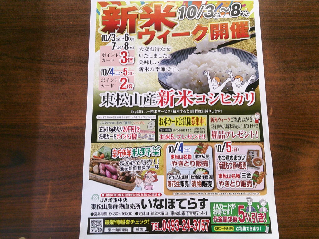 明日から東松山直売所「新米ウィーク」を開催いたします。今週の土、日は外売りコーナーが賑やかになりますので、ぜひご来店下さい。
