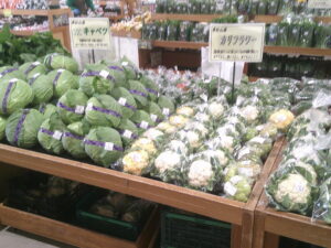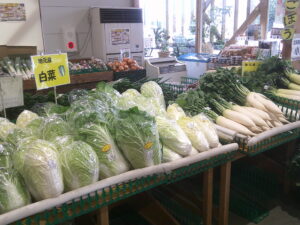 店内には地元産のブロッコリー、カリフラワー、白菜、大根などの新鮮野菜!