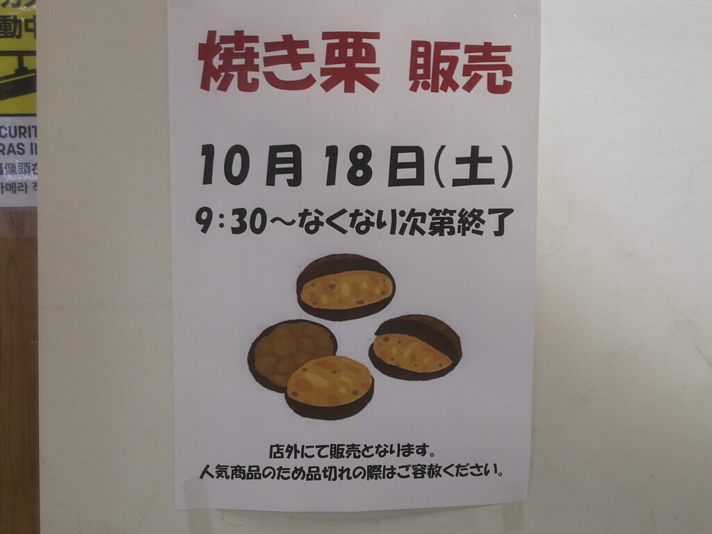 それと、お知らせです。今週末、10月18日土曜日は、東松山市産の焼き栗を店頭販売いたします。売り切れ次第終了となりますので、ぜひ、ご来店下さい。