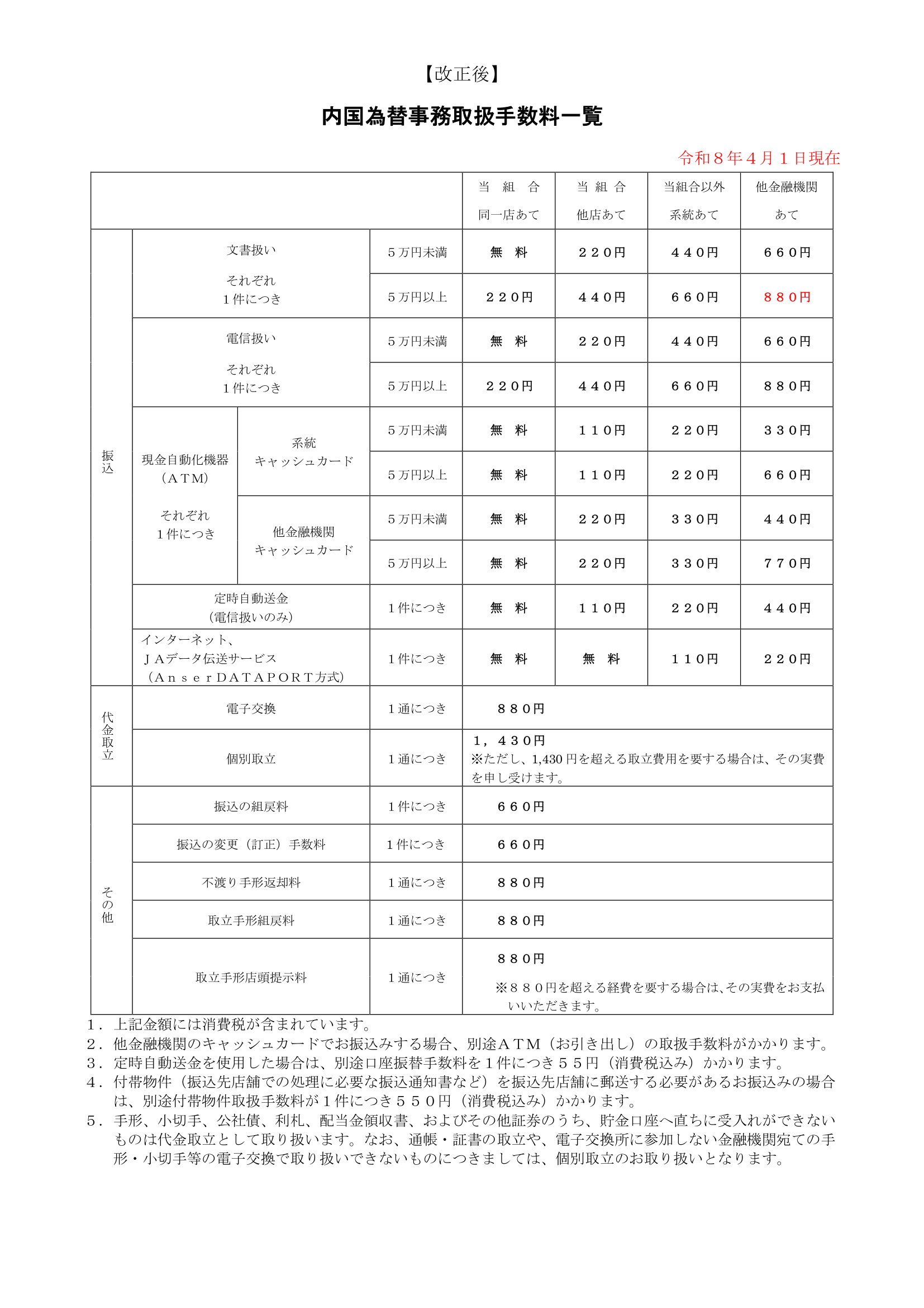 2026年4月1日より、内国為替事務取扱手数料を改定させていただきます。