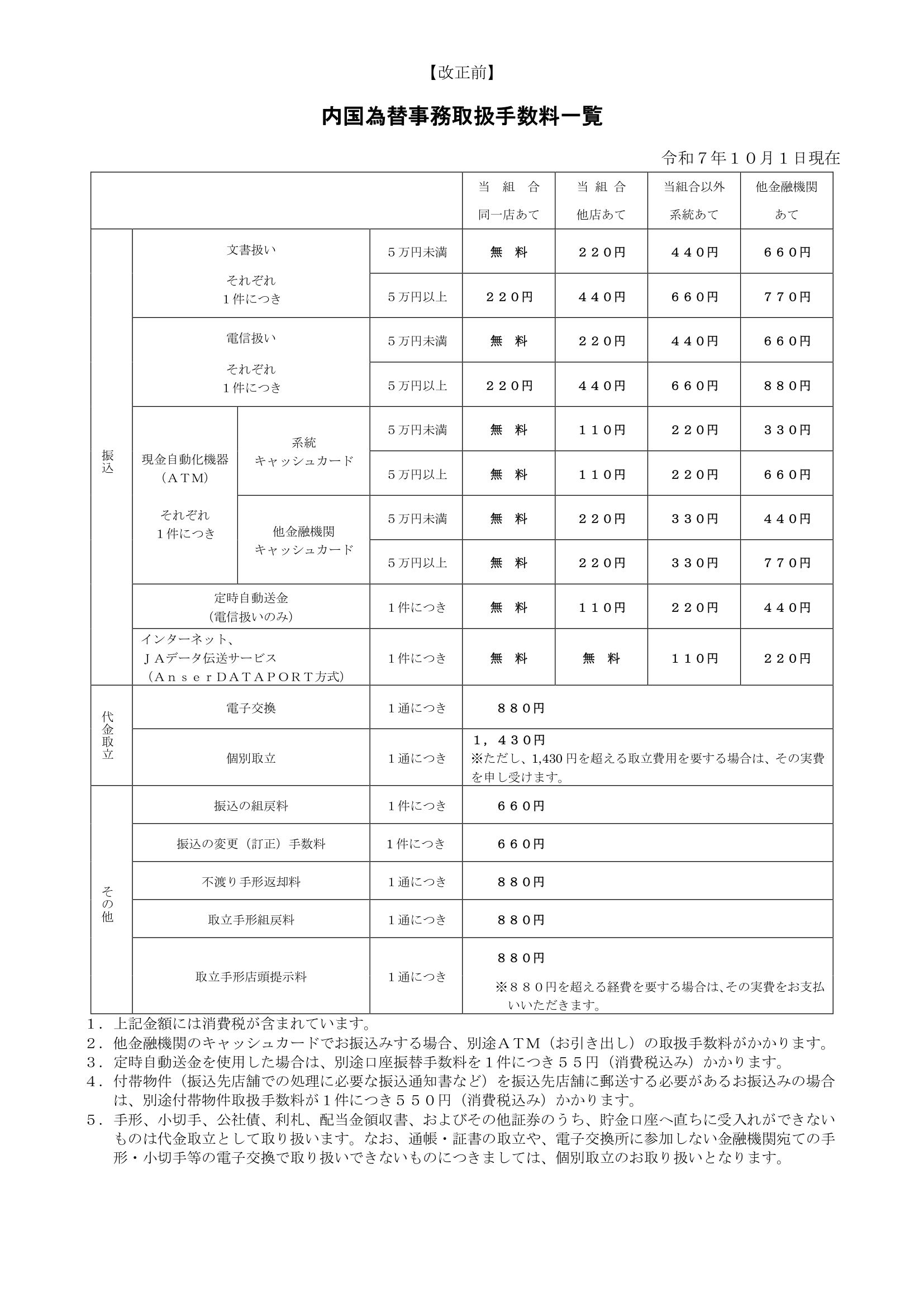 内国為替事務取扱い手数料一覧表