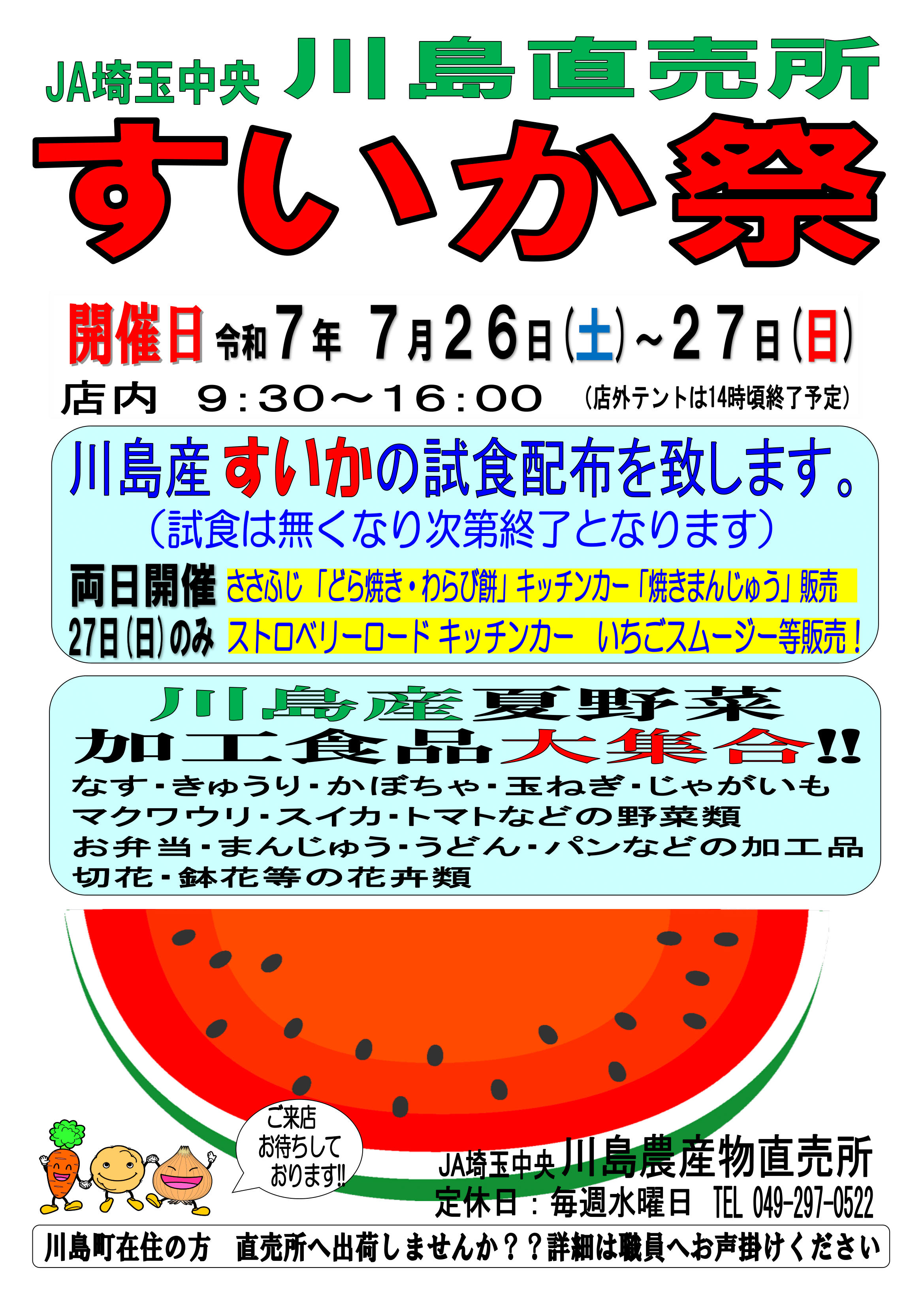 - 川島直売所 7/26(土)~7/27(日)「すいか祭り」開催!