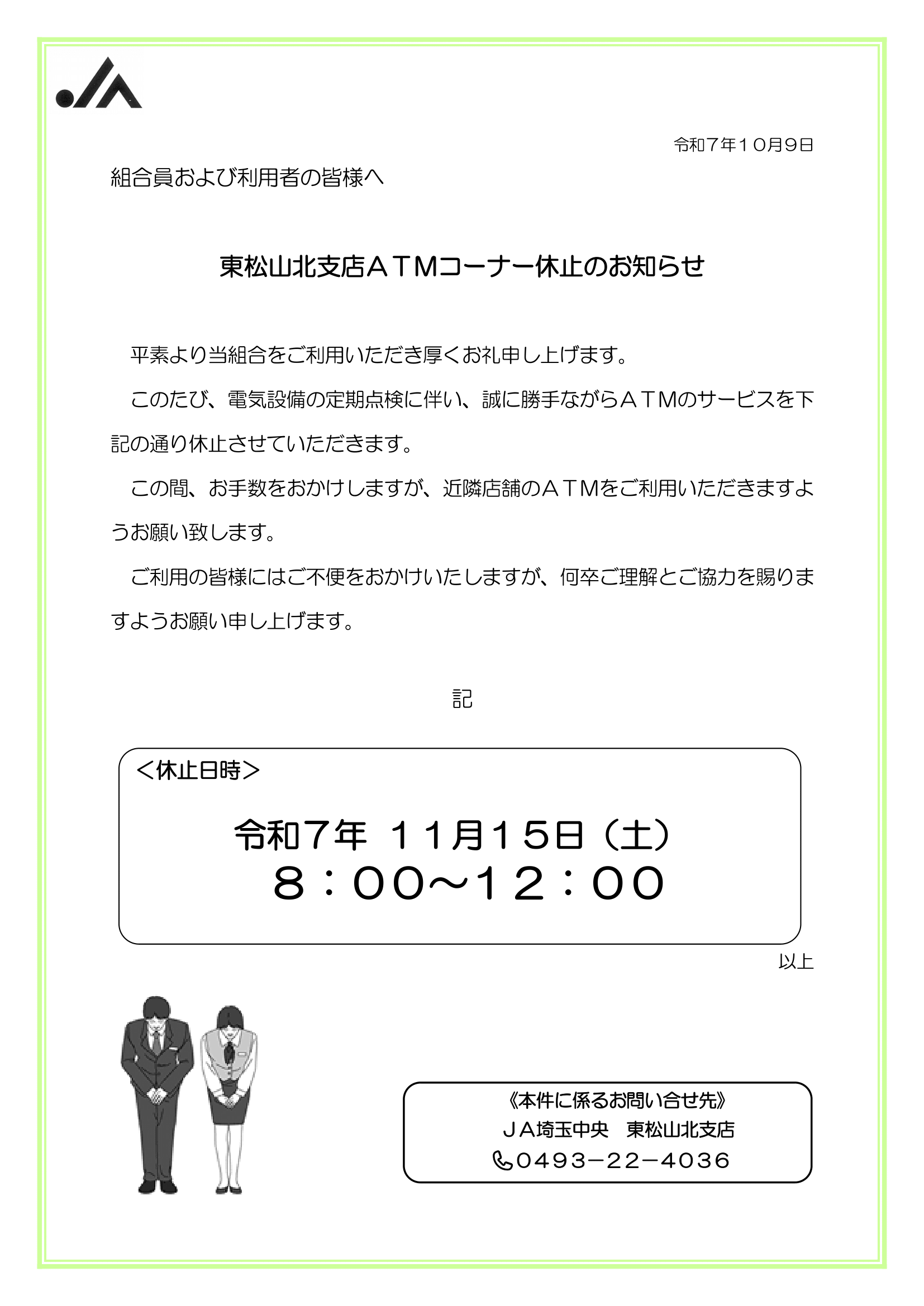 東松山北支店ATMコーナー 一時休止のお知らせ