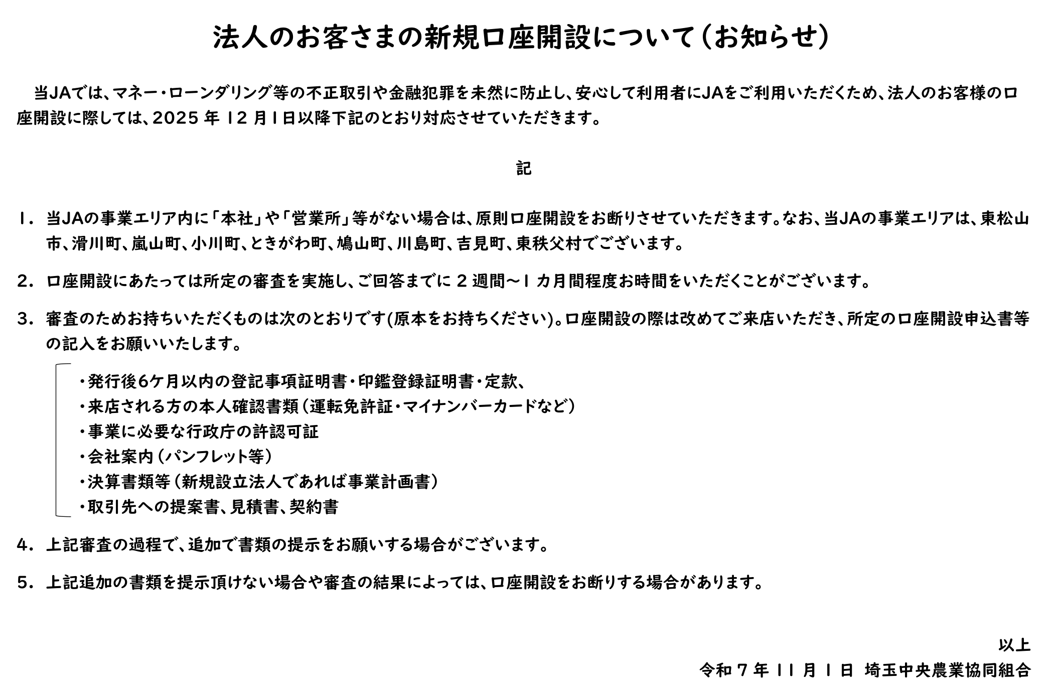 法人のお客さまの新規口座開設について(お知らせ)