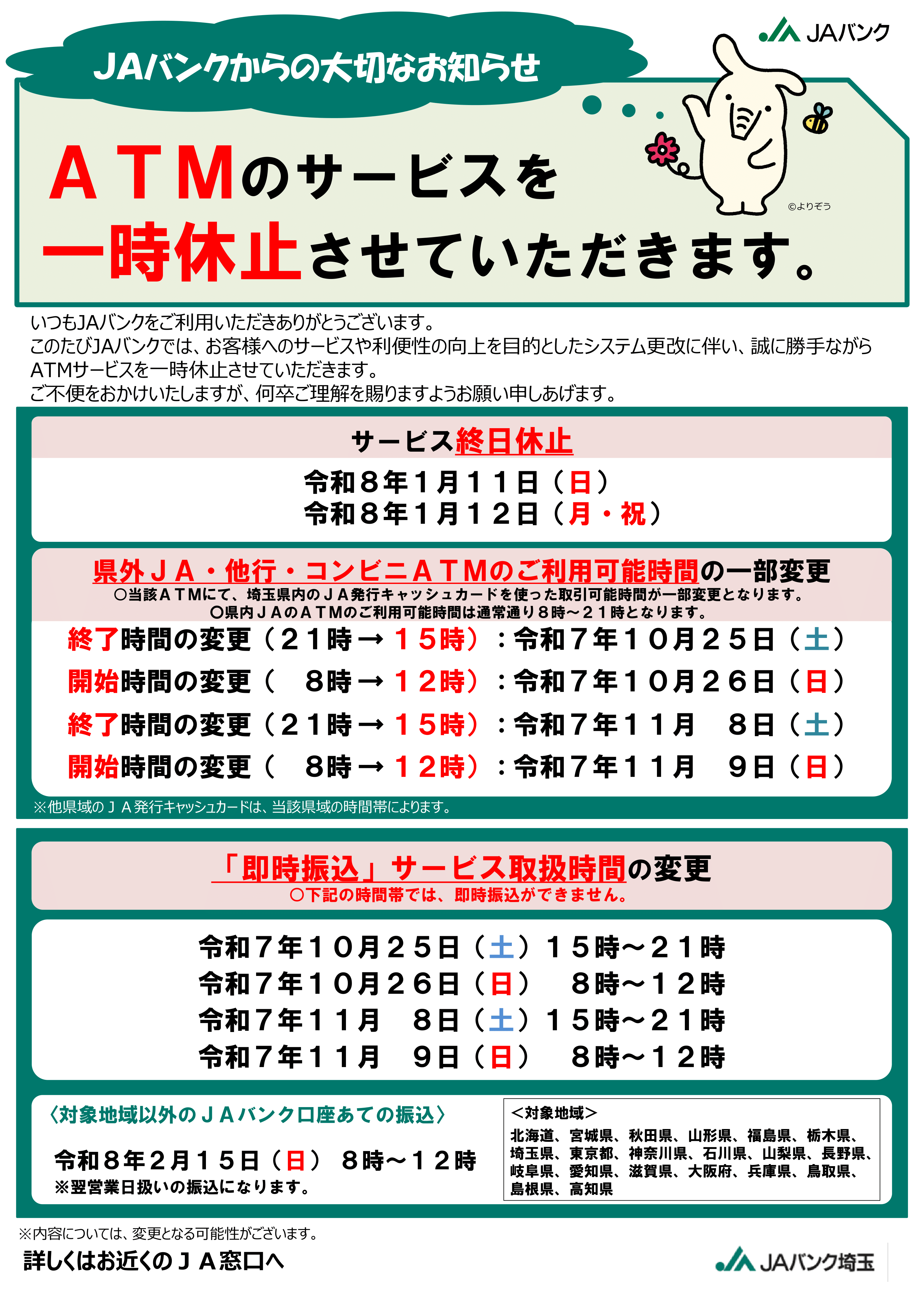 JAバンクからの大切なお知らせ(ATM・各種サービスの一時休止について)