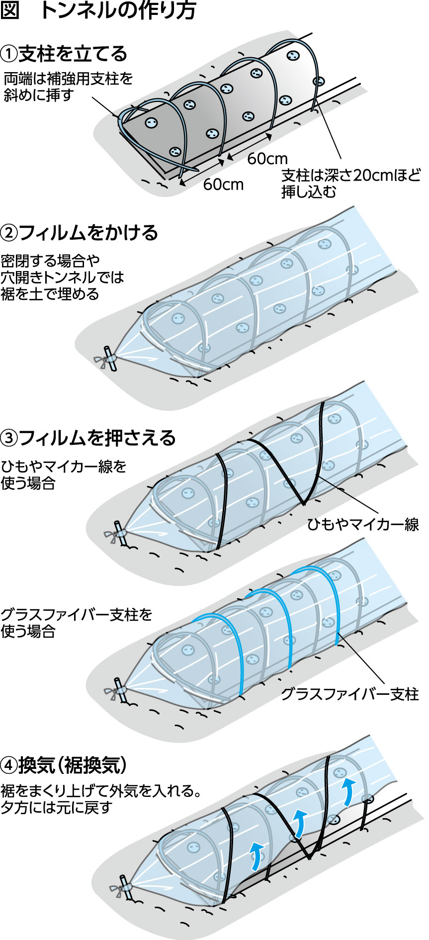 春に向かって光が強くなったら、トンネル内は30度を超えるため、温度が上がり過ぎないように換気をします。フィルムの裾を開閉する「裾換気」と、フィルムに直径10cm程度の穴を開ける「穴開け換気」があります。資材の再利用や換気の手間を考え、種まき時期にかかわらず穴開き率(フィルム表面積に対する穴開き面積の割合)1.2%程度の資材を選択すると換気の手間を省けます。