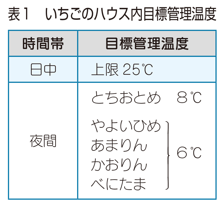 - ○いちごの株付近の気温を測定し、表1を目標に管理しましょう。(日平均気温が測定可能な場合は、15℃を超えないように)
